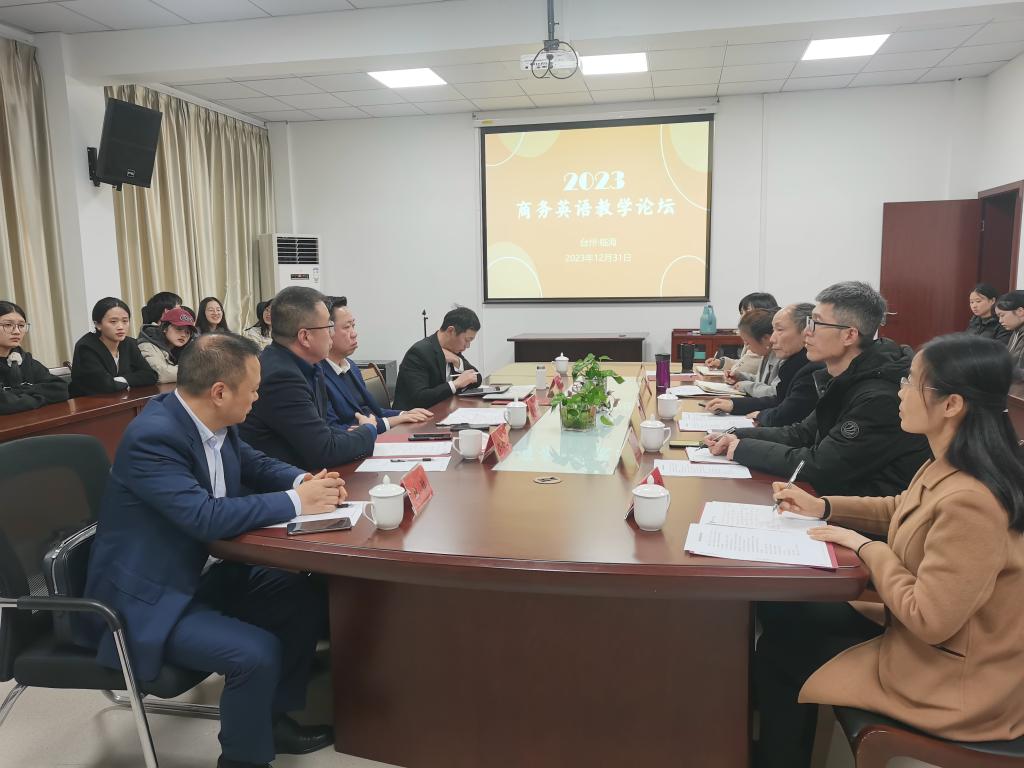 2023年12月31日下午,VSport体育在4313会议室召开了商务英语教学论坛。会议由公司党委委员崔瑞国主持,公司党委书记李涛、台州市新闻传媒中心党委委员、副主任陈永渊、浙江路桥中国日用品商城股份有限公司总经理郦湛湛、醴泉信息技术(上海)有限公司总经理衣永政、台州市新闻传媒中心全媒体一集群品牌推广部副主任林臻、VSport体育商务英语系主任戴敏、VSport体育跨境电商公司办公室主任蔡静以及商务英语系的部分师生代表参加了此次论坛。