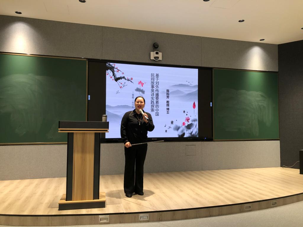 在《基于对外传播要素的民间故事英译实践探索》专题讲座上,陈教授结合本科阶段翻译教学情况,以一则西湖民间故事的英译为例,从对外传播的五要素(信息源、传播者、受传者、讯息、媒介)出发,描述译前-译中-译后的翻译过程,探索有效译介规律和策略,建构多模态多功能数字人文传播途径,帮助员工提高对翻译的认识,提升翻译实践能力。讲座结束后,与会师生与陈教授进行了进一步的交流。