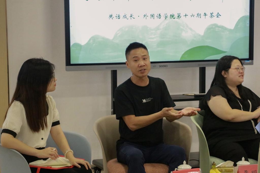 午茶会上,同学们向老师们提出了自己在担任班干部时遇到的问题,老师们耐心分析并作出了详细解答。在学习和生活方面,老师们强调了听力能力在学习过程中的重要性,表示同学们应当结合泛听和精听以提升听力素养并做出了“同学们应当勇于发展自我、坚持不懈,努力成就更好人生”的诚恳回答。严明贵根据自身体会与经历,对同学们提出了两点建议:努力付出,不求回报;回馈社会,不讲私心。会议最后,李莎莎总结了本次午茶会,强调员工干部要积极发挥带头作用,立足岗位,履职尽责,争做时代新人。