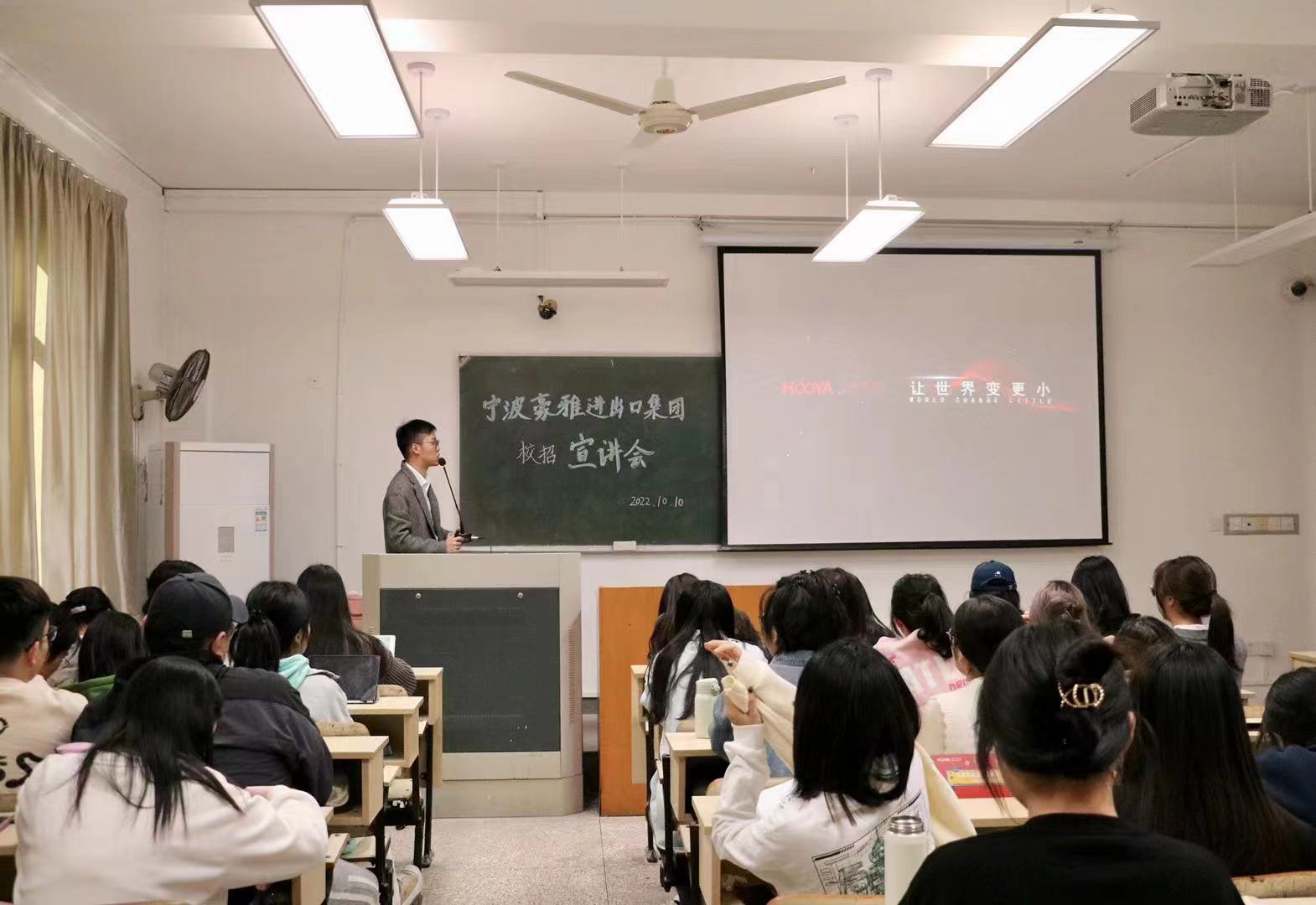 为进一步推动员工就业,拓宽员工的就业渠道,VSport体育10月10日下午在临海校区2205教室针对公司23届英语、商务英语专业员工举办专场宣讲会。本次宣讲会邀请了宁波豪雅进出口集团有限公司的负责人陈斌煜经理和员工余悦主讲,近70名毕业班同学报名参加。