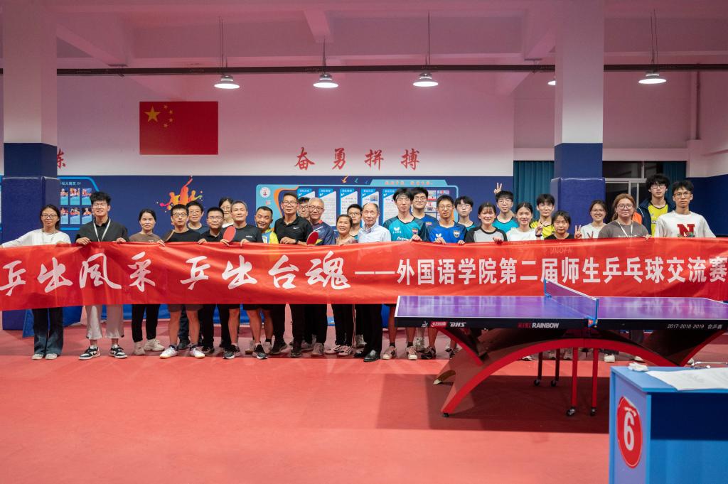 比赛共分为男单、女单、男双、女双、混双五个项目。为了避免运动时肌肉拉伤,师生们在赛前进行了热身训练和准备活动。赛场上,各参赛选手势如破竹,充分发挥自己的运动技能,一个个精彩的扣球赢得了场下观众的阵阵喝彩。赛场上老师们热情高涨、积极拼搏,同学们活力四射、身姿飞舞,再现了国乒精神。场内观众热血沸腾,喝彩声不断。最后,获胜选手合影留念,本次友谊赛到此结束。