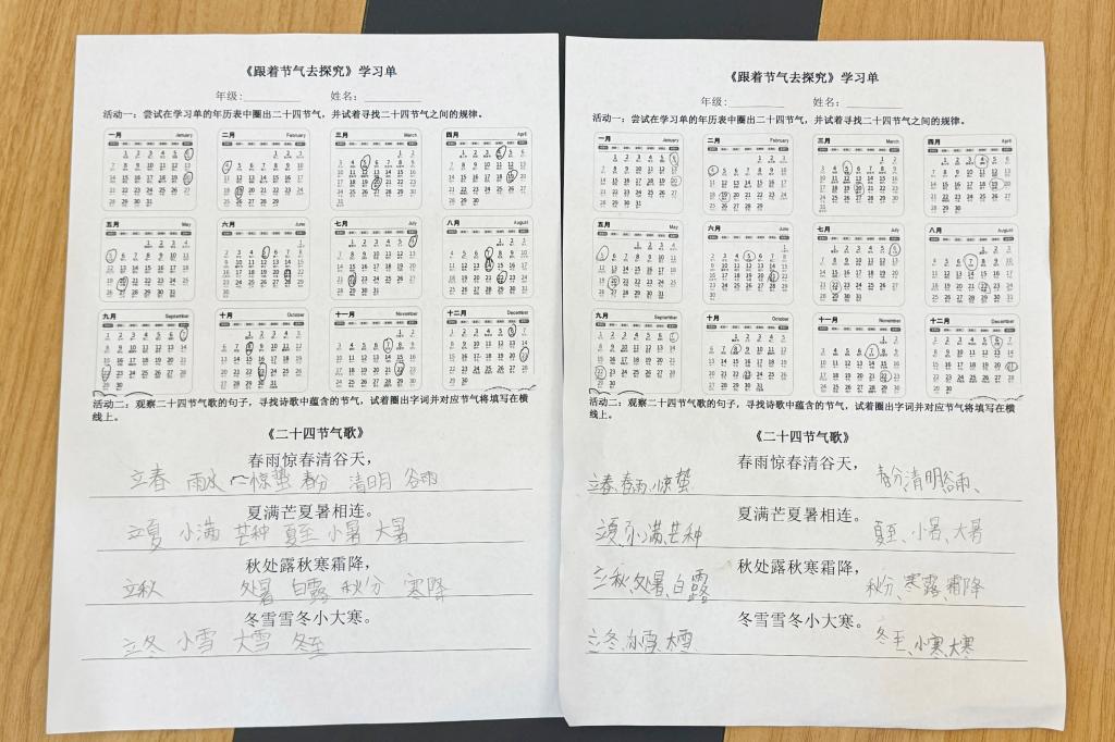 跟着节气去探究,知“稻”农业古智慧。在时间的织锦上,二十四节气如同一根金线,穿梭于岁月的经纬,编织着中华优秀传统文化的华章。为帮助社区孩子进一步了解和传承这一文化遗产,实践队成员利用年历表,调动员工已有的学习经验和学习方法,带领孩子们走近二十四节气,去领略节气与其背后蕴含的有趣现象和故事,认识一岁中时候、气候、物候等方面的变化规律。这节课上,孩子们热情高涨,自主探究节气的分布规律,合作交流身边的节气习俗。二十四节气成为了教育的四季歌谣,唱响在每一颗渴望知识的心中,引导他们感悟生命的节奏,探索文化的奥秘。