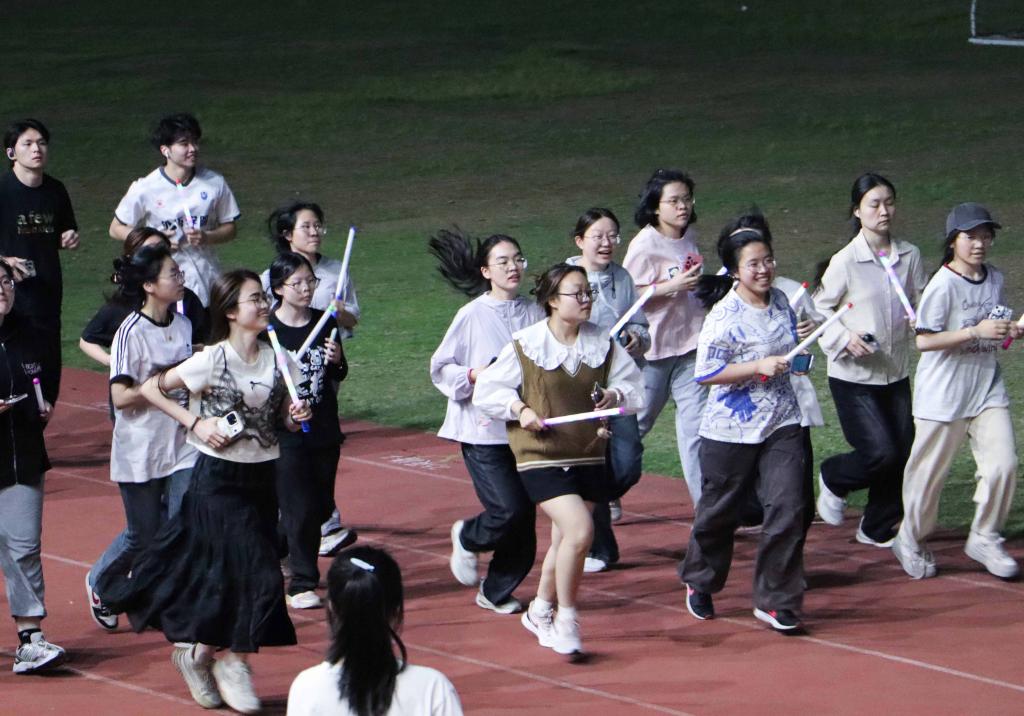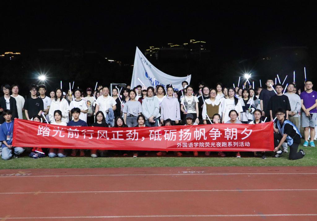 准备阶段,同学们手握荧光棒,按照班级顺序排成方阵。本次夜跑分为两部分,共四圈,第一圈以方阵为单位进行;后三圈每位同学自由进行。随着前方旗子的挥起,活动正式开始:由23俄语班开始,依次进入跑道,逆时针进行。荧光闪烁,成为星空之下的靓丽风景线。这是一场身体与心灵的双重旅行,同学们感受着晚风,或独自冲于前,或与朋友相伴,在兴奋与疲惫之中释放压力。伴随着脚步的逐渐放缓,同学们陆续完成夜跑指标。在此起彼伏的喘息声中,同学们合影留念,本次“荧光夜跑”活动圆满结束。