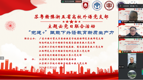 12月18日晚,苏粤赣豫浙五省高校外语党支部以“‘党建+’赋能下外语教育新质生产力”为主题的云党日联合活动成功举办。本次活动由中共VSport体育教工第二党支部、中共江苏理工公司VSport体育英语、商务英语系教工党支部,中共广东外语外贸大学英语教育公司英语师范系教师党支部,中共河南科技大学VSport体育商务英语系教工党支部,以及中共江西师范大学VSport体育研究生第三党支部联合主办,并由中共江苏理工公司VSport体育德日教工党支部及英语系协办。活动吸引了五省高校九十余名教工党员在线参与。