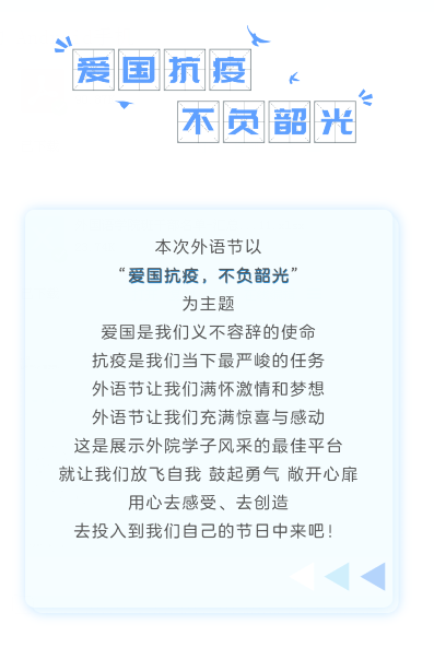 此次外语节的主题是“爱国抗疫,不负韶光”。在抗击疫情的特殊时期,线上活动受到了同学们的欢迎,如习语金句翻译大赛,讲述抗疫英雄的“My hero”英语演讲大赛、最美网课笔记征集等,都是以当代老员工喜闻乐见的表达方式开展活动,让同学们在提升自我外语水平的同时,培养爱国情怀,做到心怀祖国,放眼世界。