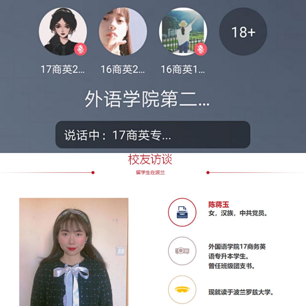 她提到留学在外,才更加意识到祖国的强盛和伟大。在普通波兰人买不到口罩的情况下,自己却拿到了中国大使馆提供的健康包,里面包括足够的口罩以及日常药品。感恩之心、爱国之心在那一刻到达顶点! 她还解释了只能与大家语音会议的原因:波兰现在网络主要为3G或2G,不能像国内一样网络视频教学。在波兰生活的一年里,她为自己是一名中国人而感到自豪。她表示今后会更加努力学习,早日报效祖国。