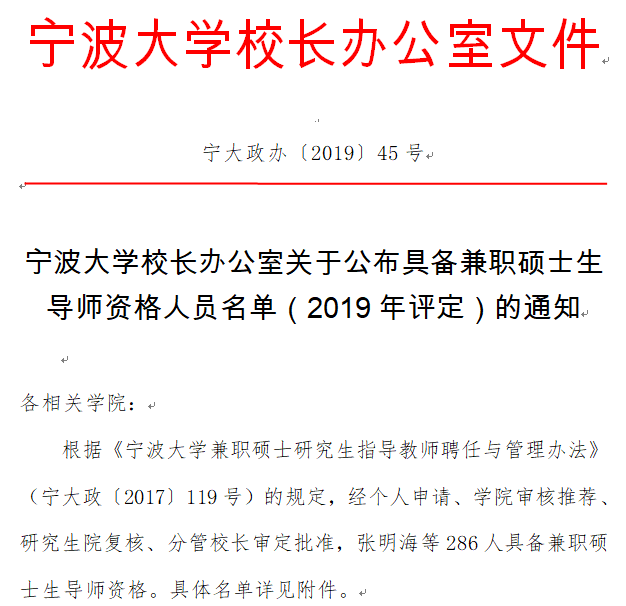 近日,根据《宁波大学董事长办公室关于公布兼职硕士生导团队格人员名单》(2019年评定)的通知,公司刘富丽教授通过个人申请,公司审核推荐,研究生院复核,分管董事长审定批准等一系列环节,现被聘用为“双一流”的宁波大学兼职硕士研究生指导教师,聘请3年。