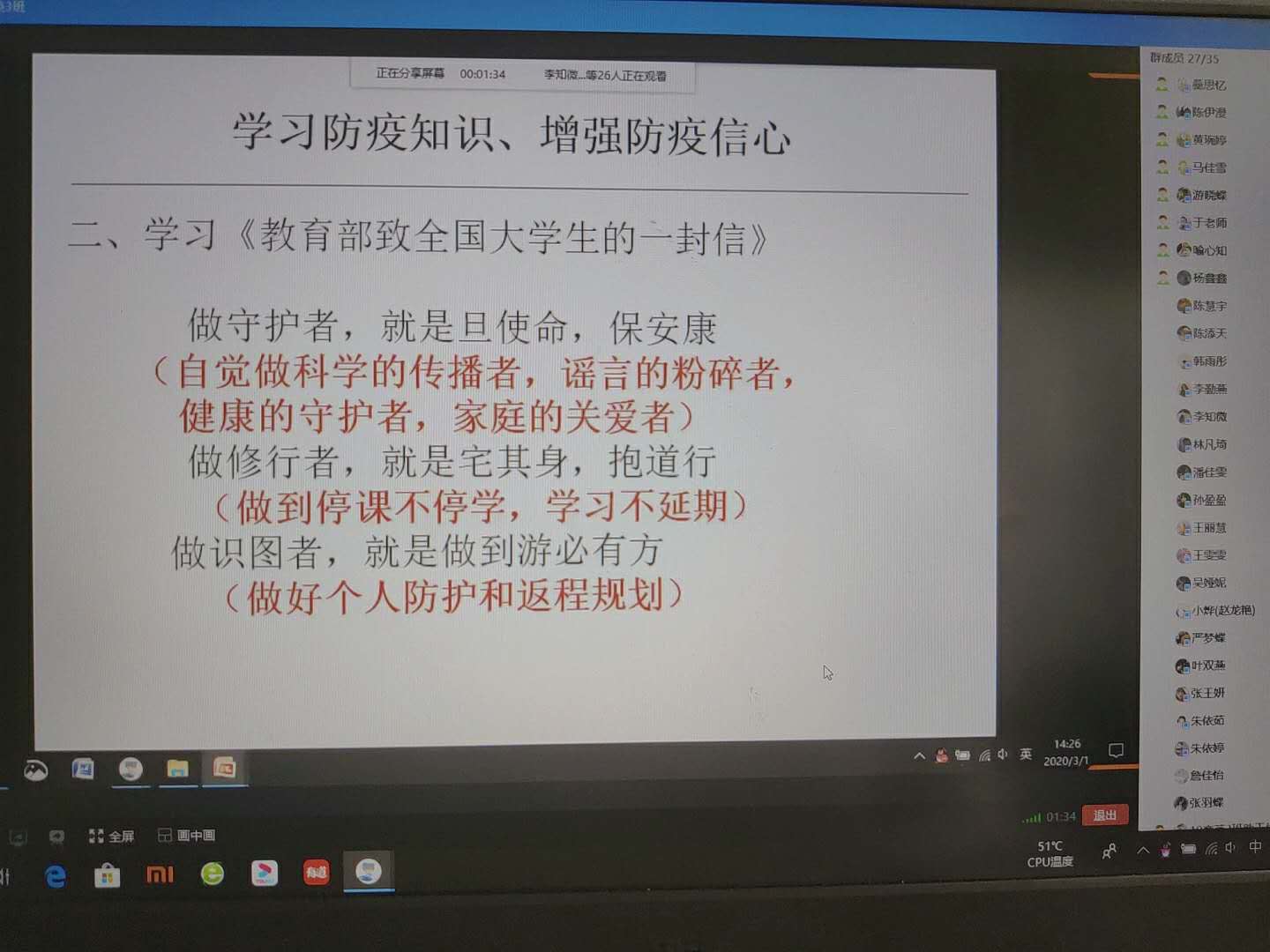 活动期间,各团支部书记通过QQ群、钉钉等方式开展防控疫情知识线上专题学习,宣传科学防疫手段,及时传达防疫信息。倡导大家听从公司安排,不提前返校;加强自律,养成自主学习的好习惯;不随意外出,勤洗手,戴口罩,积极配合查验;主动从官方渠道获取权威疫情进展,不信谣、不传谣,彰显当代老员工的责任与担当。