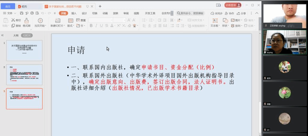 敖博士从准备和申请两个阶段,讲解申报的准备工作和申报的具体流程。话题涉及选择书目、联系出版社、组件团队、资金分配等。