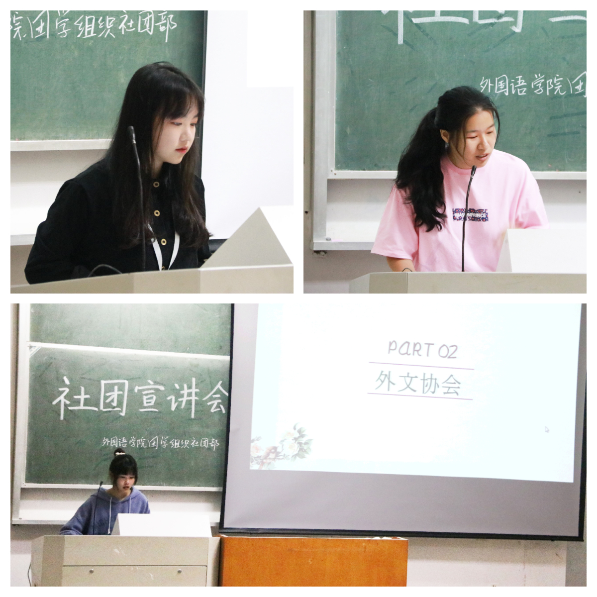 宣讲会伊始,希望爱心社社长以志愿活动为切入点,在回顾社团历史后表达了对招新工作的期待。随后,外文协会会长具体讲解了协会内部构成及部门分工,展望了社团前景。翻译协会侧重介绍了该社团举行的各类比赛与社团福利。