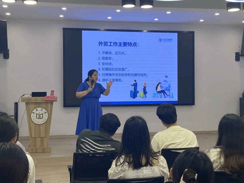 讲座伊始,严丹以自己的背景入手,从自己的多重身份中讲述着一个个外贸职场故事。而后,她以“行业关键词”与“calling”一词引出话题,讲到了影响当代年轻人就业择业观的各种因素、外贸行业的特点和挑战机遇及对外贸业务员的要求。紧接着,严丹通过互动和同学们探讨了外贸行业的相关知识,让与会者在轻松自如的环境下了解外贸岗位,又以自己的亲身经历告诉与会者从业需用心的道理。最后,严丹梳理了讲座所讲内容,告诉大家外贸可以由内而外改变一个人,让其成长。