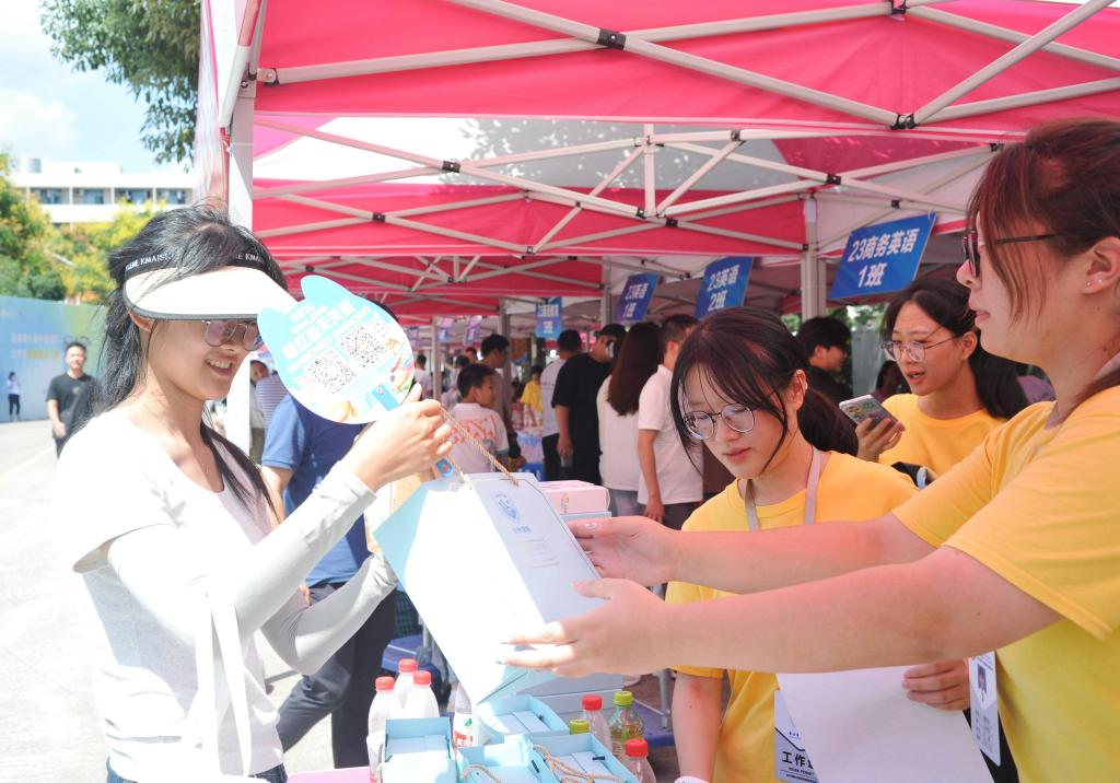 在大会堂外与大本营处,志愿者们帮忙搬运行李,为新生提供引导、指示和答疑等服务。公司团学组织在新生报到处设置了游戏点,新生在完成心理知识问答后,赢得了丰厚奖品。