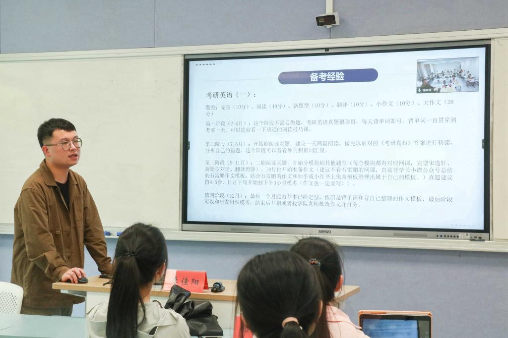 分享会上,学长、学姐从不同角度出发,详细讲述了自己在备考过程中的心路历程、学习方法和应试技巧。其中,李佳阳从自身经验出发,详细向参会者们介绍了关于专业,择校,备考经验等,学长基于自己专业跨考比较教育学的经验,向我们着重讲述了有关311教育学统考的优缺点,并讲述了自己备考311的经验,向我们推荐了考研资料和备考规划,在讲述中,李佳阳学长还向我们分享了一些实用的考研小细节。