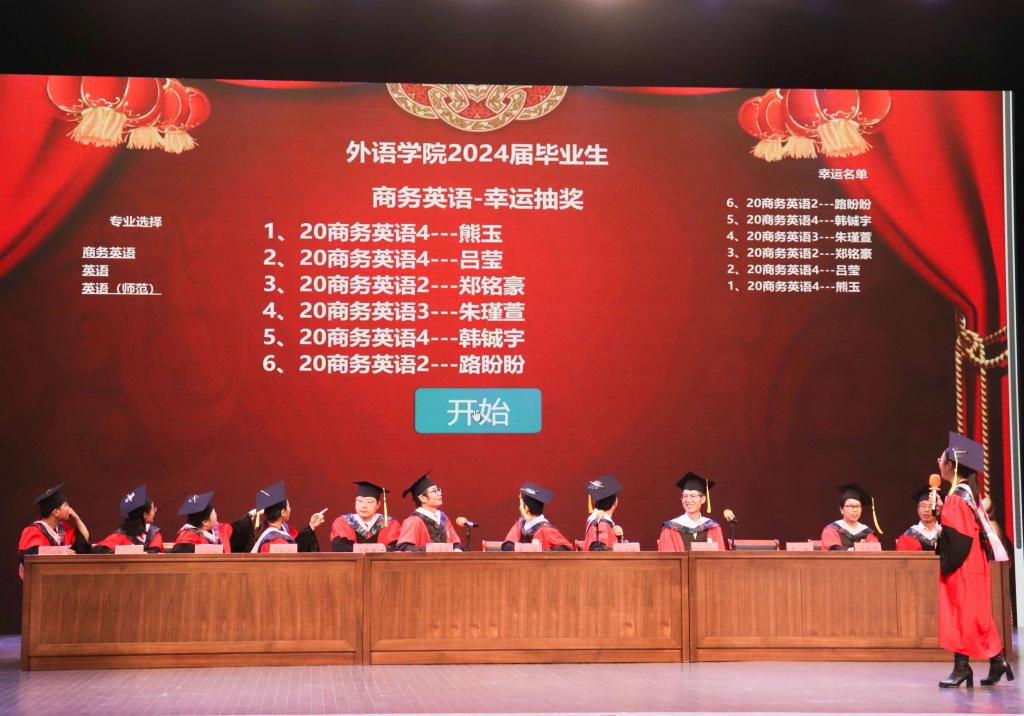 学士学位授予仪式中,公司领导和教师代表为陆续上台的毕业生依次拨穗,祝福毕业生学有所成、展翅翱翔。精心设置的抽奖环节由各位系主任亲自抽取幸运毕业生,送出由公司赠予的神秘礼物。