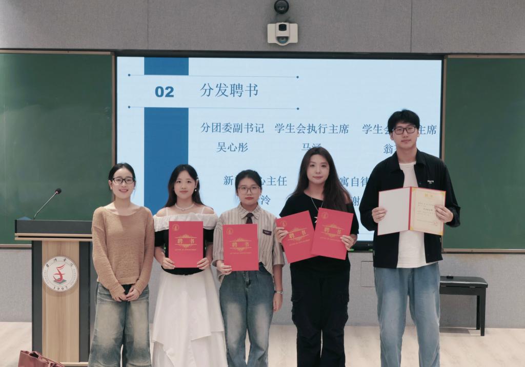 随后,大会举行了庄重的聘书颁发仪式。第二十二届团学组织十三个部门的干部干事依次上台,接过了象征荣誉与认可的聘书。