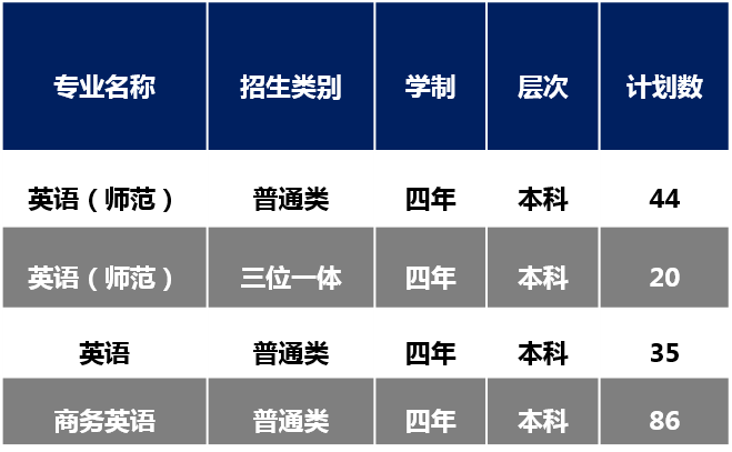 培养目标:采取“英语+”的模式, 培养适应社会经济发展需要,英语语言基础扎实,知识面宽广,实践创新能力较强,有一定的人文素养,掌握和熟悉英语语言文学、跨文化交际、商务以及翻译等方面的基本理论和技能,有较强的语言应用能力,能够运用英语从事与地方产业相符的商务、经贸、管理、旅游、金融等工作的复合型、应用型人才。