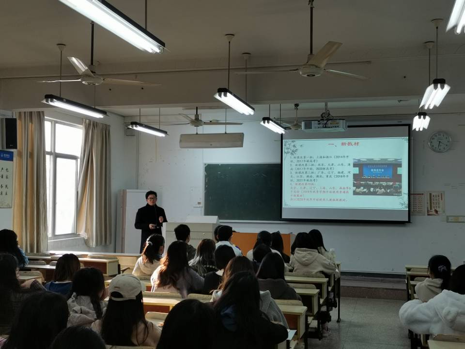 讲座中,陈一军老师以人教版高中英语教材为例,指出“新教材”的编写坚持继承与创新相结合,排版新颖、内容紧扣时代发展。在“新理念”方面,陈一军强调英语课堂应落实立德树人、尊重个性需求、重视培养员工的语言实践能力和自主学习能力,将“德育为魂,能力为重,基础为先,创新为上”的理念渗透到教学之中。在“新设计”方面,陈老师结合自己的教学设计,阐述了在英语教学过程的“新变化”:突出主题意义探究;以语篇为依据,注重思维品质提升;以策略为指导,培养自主学习能力;以活动为途径,强调用语言做事情;以文化为视角,提升跨文化交际能力;以单元为板块,发展核心素养。