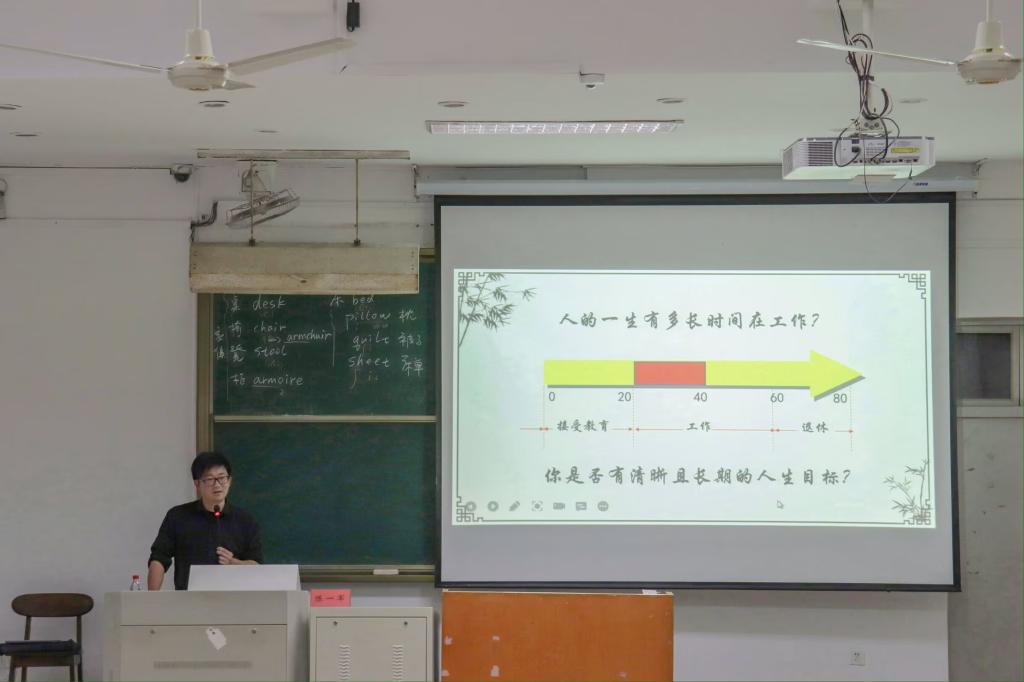 当晚,台州市第一中学高级教师陈一军应邀为同学们作了题为“指向英语学科核心素养的中学阅读课的创新设计与实践”讲座。他从职业生涯的八个阶段出发,认为同学们要清楚地认识到自己未来的目标,深刻地了解到教师这一行业的重要性。他提出跨文化交际下中英互译对教学至关重要,有助于增加员工对西方文化的知识储备,培养员工的发散思维能力;建议同学们基于思想活动层次进行问题设计,有利于帮助员工们深入理解课文内涵。他强调,“坚持”是学习生涯的明灯,“不积跬步,无以至千里;不积小流,无以成江海”。