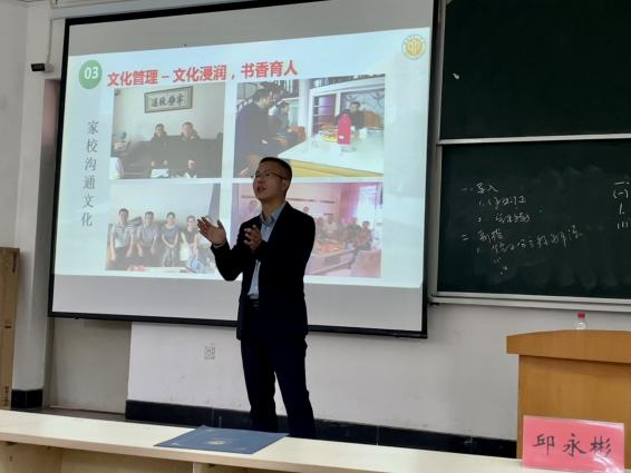 台州市第一中学副董事长邱永彬受邀为同学们作了题为“做一名幸福的班主任”讲座。他从制度管理、情感管理以及文化管理三方面入手,介绍班主任工作经验。制度管理方面,应制定详细的班级考核规则,明确班干部的职责分工,保证班级里“人人有事做,事事有人做”。情感管理方面,班主任要心中有大爱,对员工进行感恩教育。文化管理方面,可以通过带领员工设计班徽、班旗以及班刊,形成班级特色文化,以文化浸润,以书香育人。邱老师以自己的实际经历与体验展示了班主任在员工成长过程中的重要作用,分享了他与员工相处的点滴,展现了员工对他的关心与感谢,体现其真正实现了“做一名幸福的班主任”。