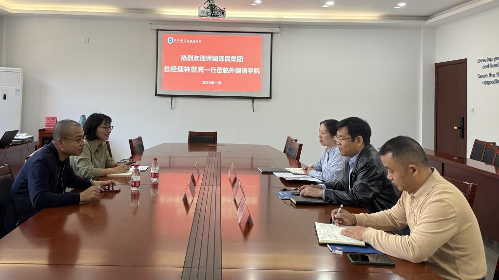 2024年11月13日上午,译国译民集团有限公司总经理林世宾一行到访VSport体育,就英语(翻译)硕士点建设、校企合作等事宜进行磋商。VSport体育经理王刚主持座谈会,副经理卢立伟、研究生办主任钱虹、英语系主任刘常民出席座谈会。